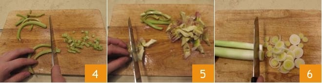 Pela los tallos de las alcachofas eliminando la parte externa más fibrosa, luego córtalos también en cubitos 4. Corta los corazones de alcachofa por la mitad, quítales la pelusa interna y córtalos en gajos 5. Lava ahora el puerro, quítale la capa exterior y córtalo en aros finos 6.