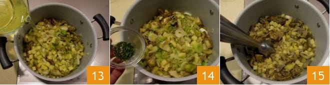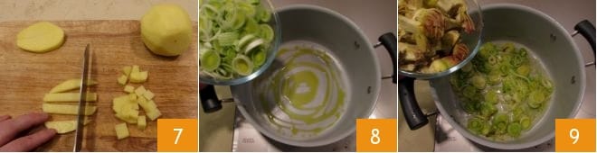 Pela las patatas y córtalas primero en gajos para hacer más fácil la preparación de pequeños dados, luego en cubitos 7. En una cazuela rociada con aceite de oliva virgen extra, añade primero el puerro 8 y, cuando esté bien dorado, los cuartos de alcachofa 9.