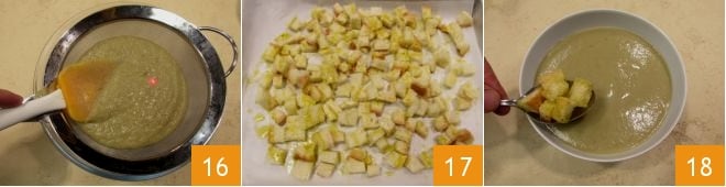 Pasa la crema por un colador 16. Poco antes de que la crema esté lista, puedes preparar los picatostes: córtalos en dados o en triángulos y repártelos sobre una bandeja con un chorro de aceite de oliva virgen extra 17. Cocínalos durante 3-4 minutos en el horno en modo grill, o saltéalos en la sartén hasta que estén crujientes.