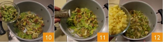 Después de poco tiempo, añade los tallos 10, luego saltea todo por un instante y ajusta de sal y pimienta 11. Añade las patatas cortadas en cubitos 12