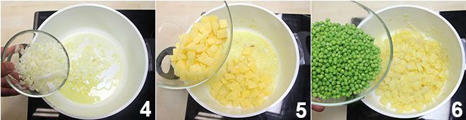 añade la cebolla para pocharla 4. Cuando la cebolla esté bien pochada, añade las patatas cortadas en dados 5 y sofríelas durante 5 minutos. En este punto, añade los guisantes 6, mezcla y cubre las verduras con caldo vegetal o agua.