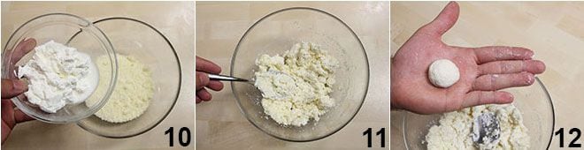 Una vez lista la crema de guisantes, procede haciendo las bolitas con el queso: en un bol, vierte la ricotta y el parmesano 10 y trabaja los dos quesos con una cuchara hasta obtener una mezcla homogénea 11. Luego, toma una cucharadita de la mezcla y trabaja dándole una forma redondeada con las palmas de las manos 12