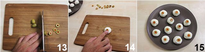 Corta las aceitunas rellenas en rodajas finas 13 y colócalas delicadamente sobre las bolitas de queso 12: las aceitunas serán las pupilas de vuestros globos oculares. Una vez listos los ojitos 15, colócalos delicadamente sobre la crema de guisantes, que habrás servido en cuencos individuales. ¿Qué os parece, tiene vuestra crema de guisantes un aspecto horripilante?