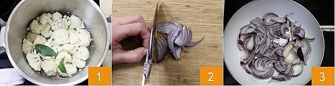 Para preparar la crema de coliflor con torcello, primero lave y limpie la coliflor, corte las florecillas y póngalas a cocer en agua hirviendo con sal durante 10 minutos (5 si es en olla a presión) junto con dos hojas de laurel 1. Una vez cocidas, escúrralas y déjelas enfriar. Mientras tanto, corte la cebolla en rodajas finas 2, caliente una sartén antiadherente con la mantequilla y luego añada la cebolla cortada en rodajas 3.
