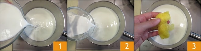 Para preparar la crema muselina, lo primero que hay que hacer es verter en un cazo la leche 1 y la nata 2. Añade la cáscara de limón 3.