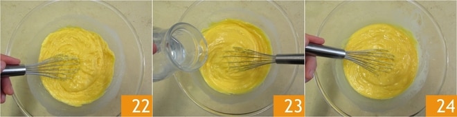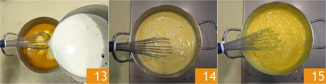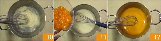 Mezcla con la batidora hasta obtener una especie de bechamel sin grumos 10. En este punto, añade las yemas 11 y mezcla con la batidora 12.