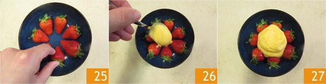 Para disfrutarla pura, simplemente coloca unas fresas en un platillo 25, añade encima la crema muselina 26 y sirve 27!