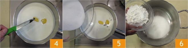 Añade también las semillas de la vaina de vainilla 4 y la mitad de la cantidad de azúcar 5. Luego lleva a ebullición a fuego lento. En otra cacerola, añade el azúcar restante y la maicena tamizada previamente 6.