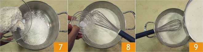 Añade la harina, también tamizada 7 y una pizca de sal 8. Mezcla con la batidora y, en cuanto la leche empiece a hervir, vierte una pequeña parte dentro de los polvos 9.