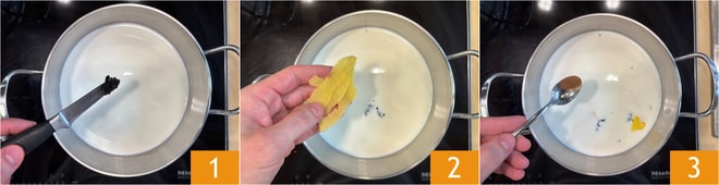 Para preparar la crema pastelera sin gluten, lo primero que tenéis que hacer es verter la leche en una cacerola, añadir las semillas de vainilla 1, la cáscara de limón 2 y la canela 3. Mezclad y llevad a ebullición.