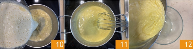 Mezclad una vez más y transferid todo de nuevo a la cacerola 10 y cocinad a fuego suave durante 8-10 minutos, hasta que espese. Removed con frecuencia 11 y cuando veáis que se forman las primeras burbujas, retirad del fuego. Pasad la crema a un bol 12 y dejad que se temple.