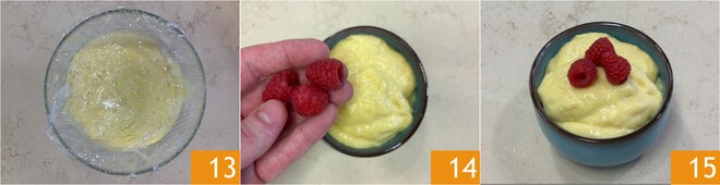 Cubrid con film en contacto 13 y dejad reposar en la nevera durante 1-2 horas. Luego podréis utilizarla como queráis, pero también podéis disfrutarla con una cuchara, poniéndola en un cuenco y decorándola con algunas frambuesas 14. La crema pastelera sin gluten está lista para ser servida 15.