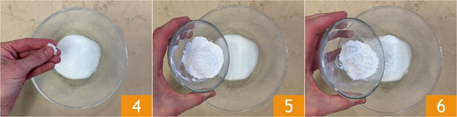 Mientras tanto, en un bol poned el azúcar, añadid la sal 4, el almidón de arroz 5, la fécula de patata 6 y mezclad rápidamente.