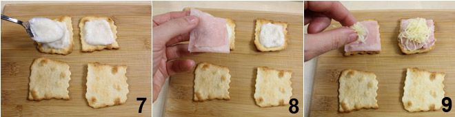 Rellena los otros 12 hojaldres con otra cucharadita de bechamel 7, un cuadrito de jamón cocido 8 y un puñado de gruyere 9.