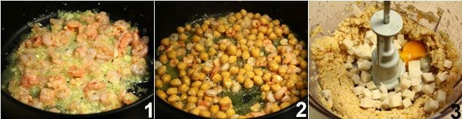 En una cacerola pon el aceite, la mantequilla, el ajo y el chalote picados; deja que todo se ablande a fuego lento durante 10-15 minutos, luego añade las gambas 1 y déjalas cocer durante 5 minutos, luego añade los garbanzos, las hojas de tomillo, la sal y la pimienta 2. Cuando todo esté bien sazonado y el fondo de cocción esté seco, apaga el fuego y deja que se temple. Vierte todos los ingredientes en una batidora y tritura, luego añade el huevo y el pan de molde reducido a cubos 3.
