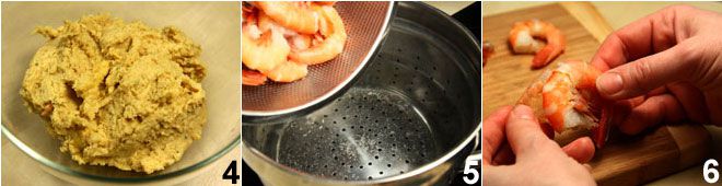 luego tritura nuevamente hasta obtener una masa lisa y homogénea 4. Mientras tanto, cuece las gambas 5 y pélalas dejando solo la parte final de la cola 6.