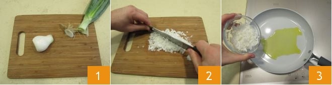 Para preparar las croquetas de guisantes y ricotta, comienza limpiando el cebolleta 1 y picándolo finamente 2 después viértelo en una sartén junto con el aceite de oliva virgen extra y déjalo pochar durante cinco minutos a fuego bajo 3.