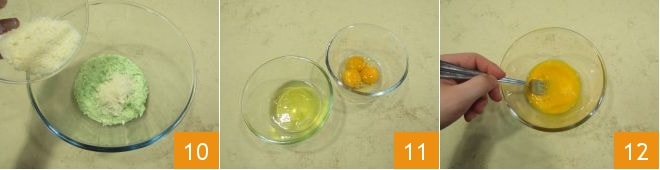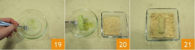 Con un tenedor bate rápidamente las claras por unos instantes 19 y luego sumerge una croqueta a la vez 20, escúrrela bien y luego pásala por el pan rallado asegurándote de que las migajas se adhieran en todos los lados 21