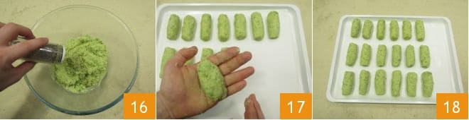 Finalmente ajusta de sal y pimienta 16. Recoge 40 gramos de masa y forma las croquetas, moldeando la masa 17 hasta obtener cilindros, ligeramente redondeados, de 3 cm de grosor y 7 cm de largo: de esta manera deberías obtener 18 piezas. Poco a poco coloca las croquetas en una bandeja donde habrás colocado un papel de horno para que no se peguen en el fondo 18.