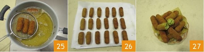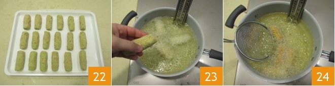 y repite para todas las demás croquetas 22. Vierte abundante aceite de semillas en una sartén y déjalo calentar hasta alcanzar una temperatura de 170° (utiliza un termómetro de cocina para medir la temperatura exacta), luego vierte 4-5 croquetas a la vez 23 de esta manera mantendrás la temperatura constante y voltea de vez en cuando para uniformar la cocción 24.
