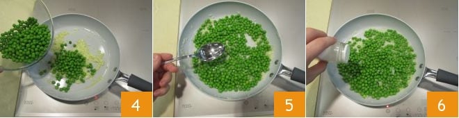 Luego vierte los guisantes desgranados 4, añade también agua 5 y una pizca de sal 6; deja cocinar durante unos diez minutos más, hasta que el agua se haya evaporado completamente.
