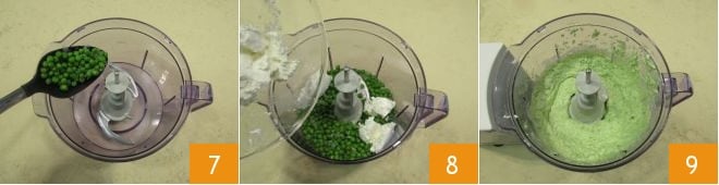 Una vez cocidos, deja que los guisantes se templen, luego viértelos en un procesador 7, añade la ricotta 8 y tritura hasta obtener una crema compacta 9.