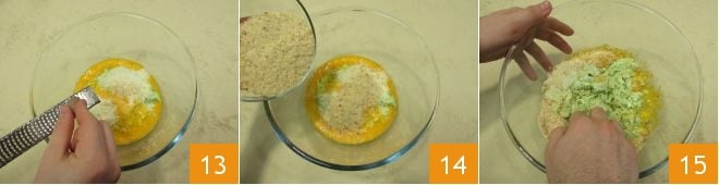 y viértelas sobre la masa. Ralla la nuez moscada 13, luego añade el pan rallado 14 y amasa con las manos 15.