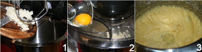 Consigue un molde para muffins, preferiblemente de 12 y 12 cápsulas de papel del mismo tamaño que las cavidades del molde. Coloca en el bol de un robot (o en un tazón, si mezclas a mano) el azúcar y la mantequilla a temperatura ambiente 1; enciende las varillas y convierte los ingredientes en crema, luego añade los huevos 2, la sal, las semillas de la vaina de vainilla, la ralladura de limón y por último la harina y la levadura. Cuando la masa esté lisa y homogénea 3, apaga el robot.
