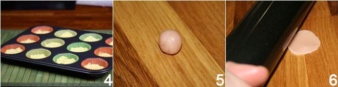 Coloca una cápsula en cada cavidad del molde para muffins, luego distribuye la masa obtenida en las 12 cápsulas 4 teniendo cuidado de no superar la mitad en volumen; al cocer, el cupcake no debe desbordarse sino llegar como máximo al filo de la cápsula. Hornea los cupcakes en horno precalentado a 180° durante unos 20 minutos. Mientras tanto, prepara las rosas de mazapán: con el mazapán rosa haz bolitas un poco más grandes que un guisante 5, aplánalas con un rodillo y forma un disco delgado 6.