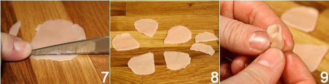 Con un cuchillito corta los bordes inferiores laterales del disco, formando una gota 7; prepara de la misma manera en total 5 gotas + otras dos tiras 8 que enrollarás para formar el centro de la rosa 9.