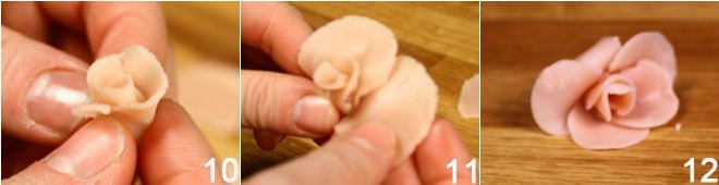 A estos dos trocitos enrollados, adhiere (presionándolas en la base) todas las formas de gota alrededor, que formarán los pétalos de la rosa (10-11-12).