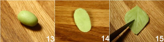 Para formar las hojas procede de la misma manera, cortando con un cuchillo de hoja lisa y puntiaguda las formas deseadas de un óvalo delgado de mazapán verde (13-14-15). Como alternativa, puedes comprar pequeñas rosas ya listas de oblea o de azúcar, fácilmente disponibles en los supermercados más surtidos.