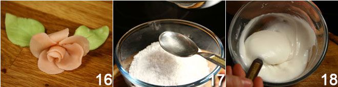 ¡Y aquí está la rosa de mazapán ensamblada 16! Ahora prepara el glaseado para los cupcakes colocando en un bol 200 g de azúcar glas avainillado; añade 4 cucharadas de agua 17 que habrás llevado a ebullición y mezcla vigorosamente hasta obtener una crema densa, brillante y sin grumos 18.