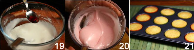 Añade colorante alimentario rosa 19, una gota a la vez, hasta obtener el color deseado 20. Una vez horneados los cupcakes 21,