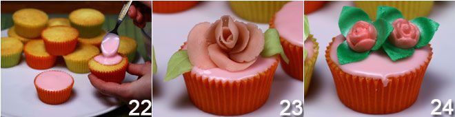 cúbrelos con el glaseado rosa 22 y coloca en cada uno de ellos una rosa de mazapán y un par de hojas 23 o utiliza las rosas de oblea 24 o de azúcar.