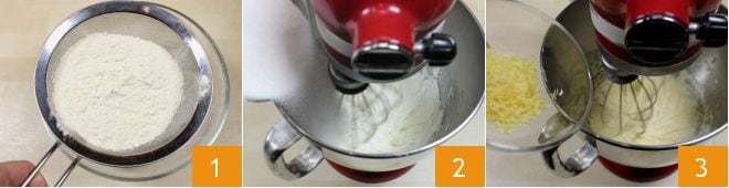 Para preparar los cupcakes de limoncello, comienza tamizando con un colador de malla fina la harina y la levadura 1. Luego, vierte en una batidora el azúcar y la mantequilla blanda 2; pon en marcha las varillas para mezclar los ingredientes (si no tienes una batidora, puedes utilizar una batidora eléctrica). Añade a la masa la ralladura de un limón sin tratar 3 y sigue mezclando.