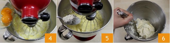 Incorpora también los 2 huevos, uno a la vez 4, luego añade una pizca de sal y finalmente agrega la harina tamizada con la levadura, poco a poco ayudándote con una cuchara 5. Después retira la mezcla de la batidora y mezcla con una espátula para integrar los ingredientes hasta obtener una masa homogénea 6.