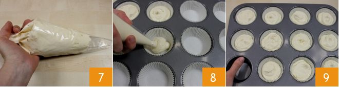 Transfiere la mezcla a una manga pastelera 7. Luego, toma un molde para 12 muffins y forra cada cavidad con un papel para cupcakes. Vierte la mezcla en cada papel 8 teniendo cuidado de no sobrepasar la mitad 9, de modo que al cocer los cupcakes alcancen justo el borde del papel. Hornea en un horno estático precalentado a 180° durante 20 minutos (160° durante 15 minutos si es horno ventilado).