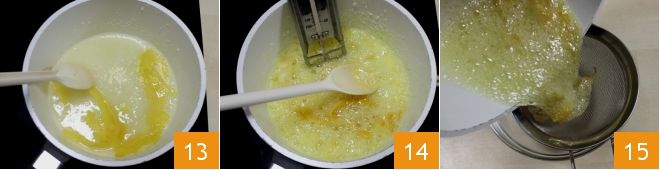 Enciende el fuego bajo y añade también las cáscaras de 2 limones enteros y sigue mezclando 13. Cuando el azúcar se haya disuelto, deja hervir el jarabe sin mezclar más y verifica con el termómetro que alcance los 121° 14. Luego apaga el fuego y filtra el jarabe obtenido con un colador de malla fina recogiéndolo en un bol 15.