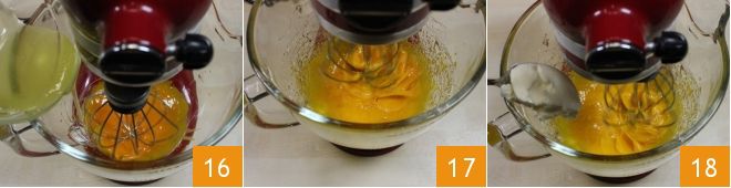 En una batidora, pon las yemas y pon en marcha las varillas (si no tienes una batidora, puedes usar un bol grande y una batidora eléctrica). Añade luego el jarabe caliente en hilo 16. Monta los ingredientes hasta que se enfríen por completo 17. Mientras la mezcla se enfría, en un bol pequeño, trabaja la mantequilla fría pero ablandada para reducirla a crema. Incorpora luego la crema de mantequilla a las yemas con el jarabe, poco a poco, continuando a mezclar con las varillas 18.