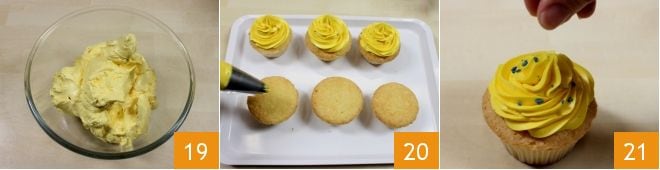 Transfiere la crema espumosa y homogénea a un bol pequeño 19. Si no la utilizas de inmediato, colócala en el frigorífico cubierta con film en contacto hasta el momento en que decores los cupcakes. Luego desmolda los cupcakes, pon la crema de mantequilla en una manga pastelera con boquilla de estrella y comienza a decorarlos con una roseta de crema 20. Puedes adornar aún más los cupcakes de limoncello con azucarillos de colores u otros confites que prefieras 24. Conserva los cupcakes de limoncello en el frigorífico hasta el momento de servirlos!