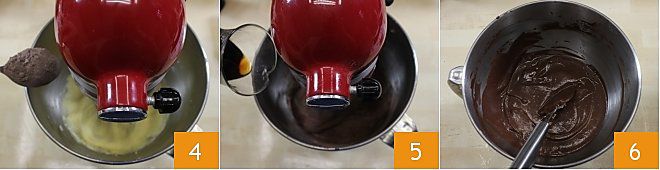 Cuando los huevos estén incorporados, añade las harinas tamizadas previamente, una cucharada a la vez 4 y por último la cerveza Guinness 5, y mezcla hasta obtener una mezcla cremosa y homogénea 6.