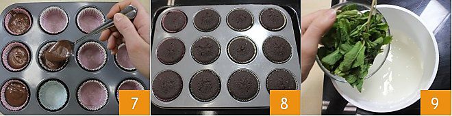 Toma un molde para muffins forrado con cápsulas de papel y vierte en cada cápsula la mezcla 7, dejando 1 cm de espacio del borde. Hornea en el horno estático precalentado a 180° durante 30 minutos 8 (o en horno ventilado a 160° durante 25 minutos). Mientras tanto, prepara la crema de mantequilla: pon en un cazo el agua, el azúcar y el ramillete de menta 9.