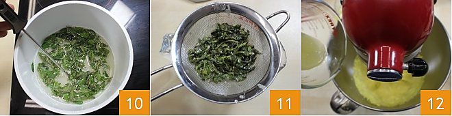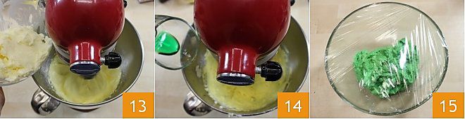 Suaviza la mantequilla y añádela poco a poco, siempre batiendo 13. Finalmente, añade el jarabe de menta 14. Cuando la crema de mantequilla esté lista, incorpora el colorante (puedes usar colorantes en polvo o líquidos, agréguelos poco a poco en la mezcla hasta obtener el color deseado) mezcla para asegurarte de que se integre bien. Ponla en un bol cubierto con film transparente 15 y consérvala en la nevera hasta el momento de usarla.