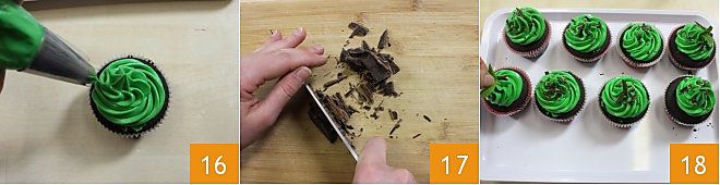Saca los cupcakes del horno y déjalos enfriar. Coloca la crema en una manga pastelera con punta de estrella y decora los cupcakes con un copete de crema 16. Pica el chocolate en virutas 17 para adornar los cupcakes y termina la preparación decorando cada cupcake con hojas de menta y virutas de chocolate 18. Conserva los cupcakes de menta y chocolate en la nevera hasta el momento de servirlos.