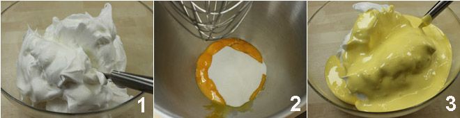 Para preparar las delicias de fresa, monta las claras de huevo (que deben estar a temperatura ambiente) con una batidora y cuando empiecen a blanquear, añade un tercio de 150 gr de azúcar, deja montar por un minuto y luego añade otro tercio de azúcar y el último tercio después de otro minuto 1. Monta las yemas con la otra mitad del azúcar durante al menos 7-8 minutos 2; cuando las dos mezclas estén listas, mézclalas juntas en un bol grande con delicadeza para no desmontarlas 3.