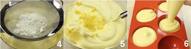 Agrega la harina previamente tamizada en un bol 4 y la ralladura de un limón de Sorrento 5, coloca la mezcla obtenida en una manga pastelera y luego exprímela en moldes de semiesfera con un diámetro de 7-8 cm 6.