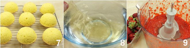 Hornea en horno estático precalentado a 180° durante unos 20 minutos, luego saca las semiesferas, deja que se templen y extráelas de los moldes dejando que se enfríen completamente sobre una rejilla 7. Pon en remojo en un bol con agua fría la gelatina en hojas durante al menos 10-15 minutos 8. Prepara la crema de fresa triturando las fresas 9 y pasándolas por un tamiz: debes obtener 200 gr de puré de fresas.