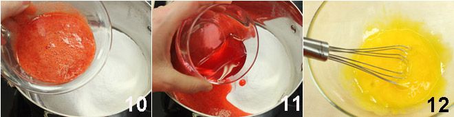 Pon en un cazo el azúcar, el puré de fresas 10, y el jarabe 11 (o si prefieres un licor de fresa) y haz que el azúcar se disuelva a fuego lento. Con un batidor, bate las yemas rompiéndolas 12