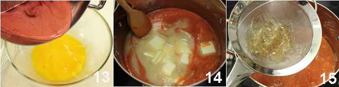 y luego vierte sobre ellas, mientras sigues batiendo, el jarabe de fresas 13; pon todo en un cazo, deja que llegue a ebullición y luego añade la mantequilla en trozos 14, mezcla durante 2 minutos, luego agrega la gelatina en hojas bien escurrida 15, mezcla unos segundos y retira del fuego.